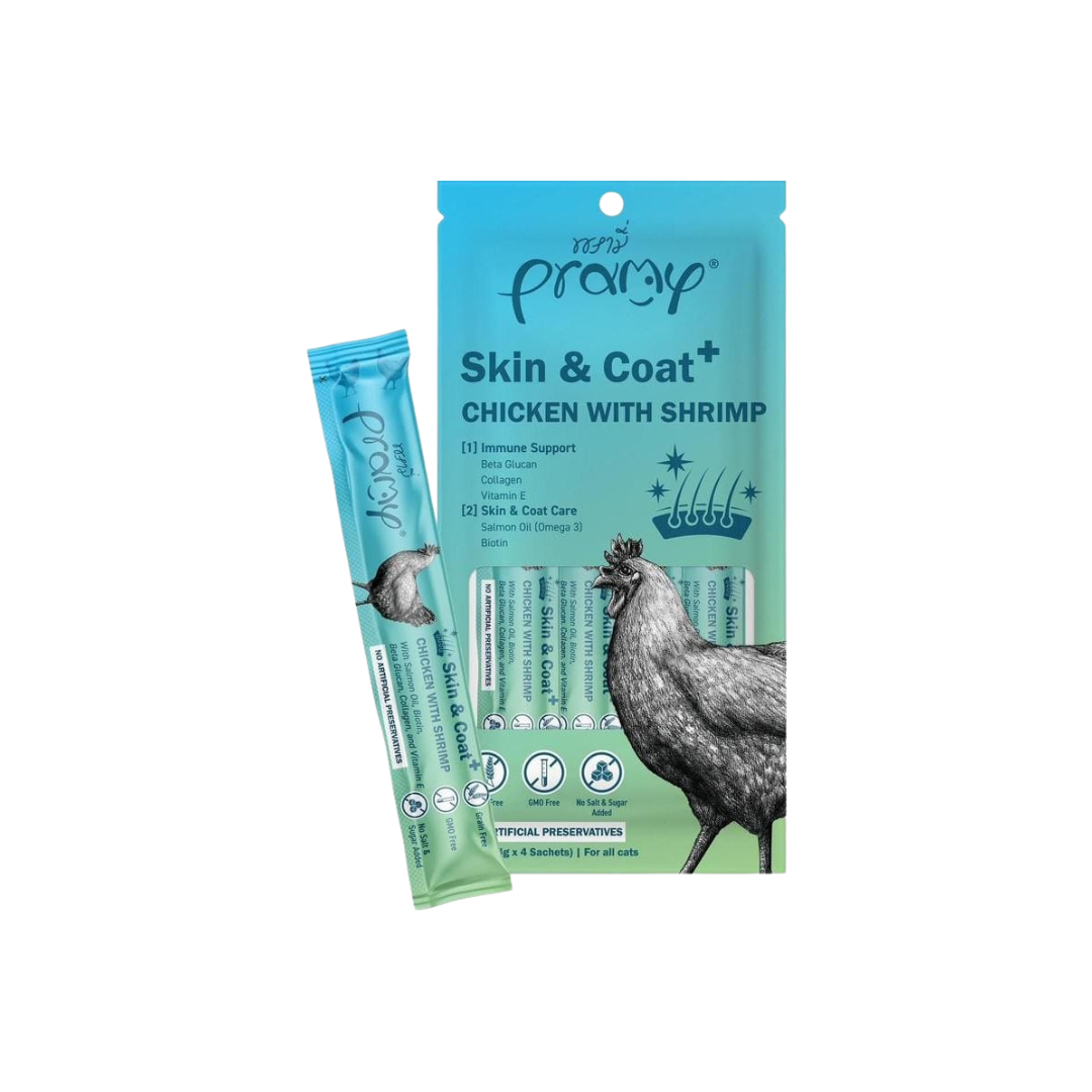 مكافآت كريمية للعناية بالبشرة والفرو للقطط من برامي بنكهة الدجاج مع الروبيان 4 قطع