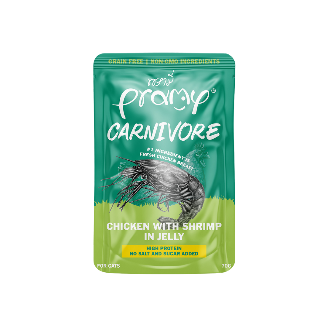 Pramy Carnivore Chicken with Shrimp is a premium wet food inspired by a high-protein, meat-based diet for cats. Made with real chicken and shrimp, it provides high-quality protein to support strong muscles and overall health.