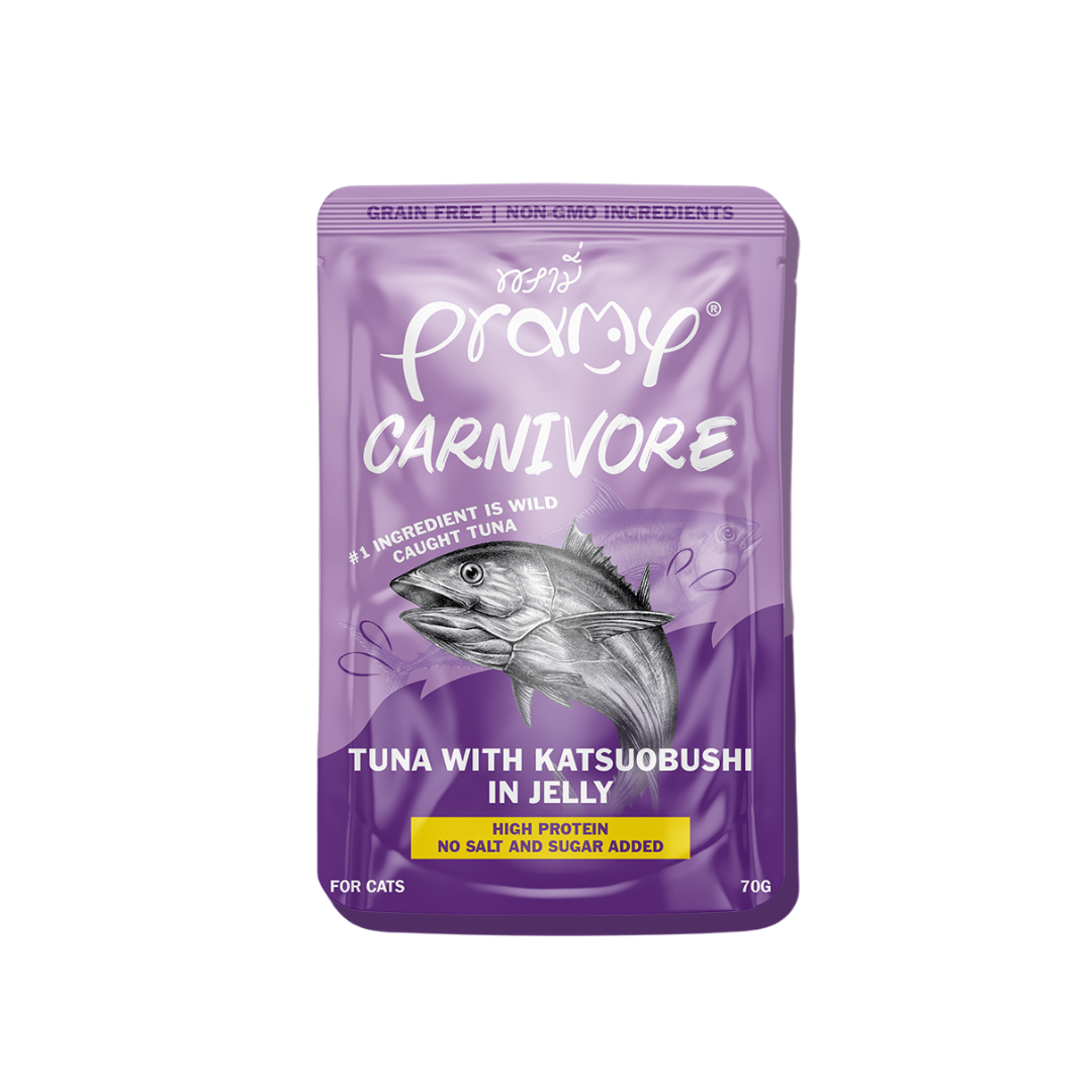 Pramy Carnivore Tuna with Katsuobushi is a premium wet food inspired by a high-protein, meat-based diet for cats. Made with real tuna and katsuobushi (bonito flakes), it provides high-quality protein to support strong muscles and overall health.